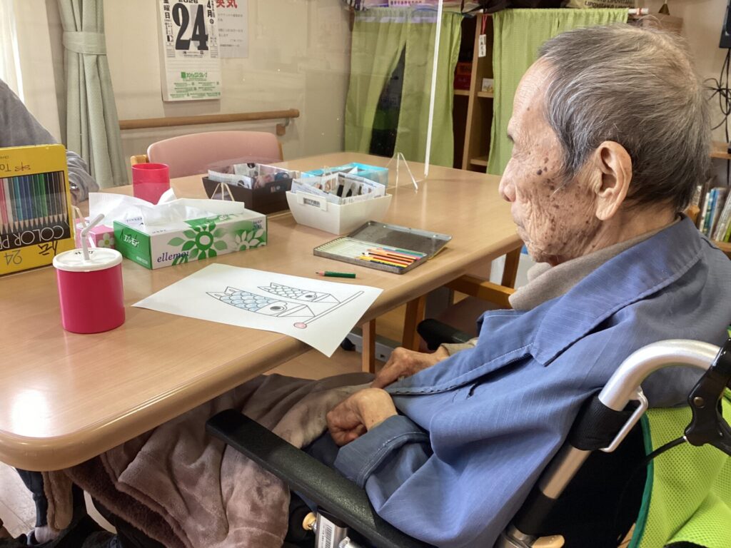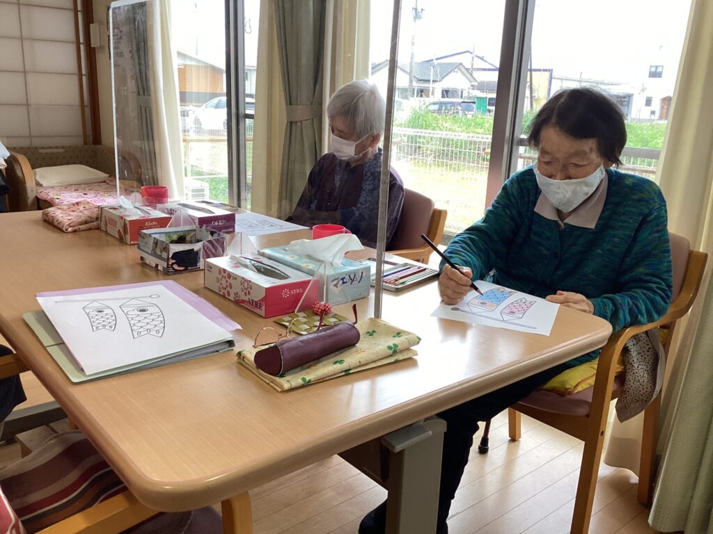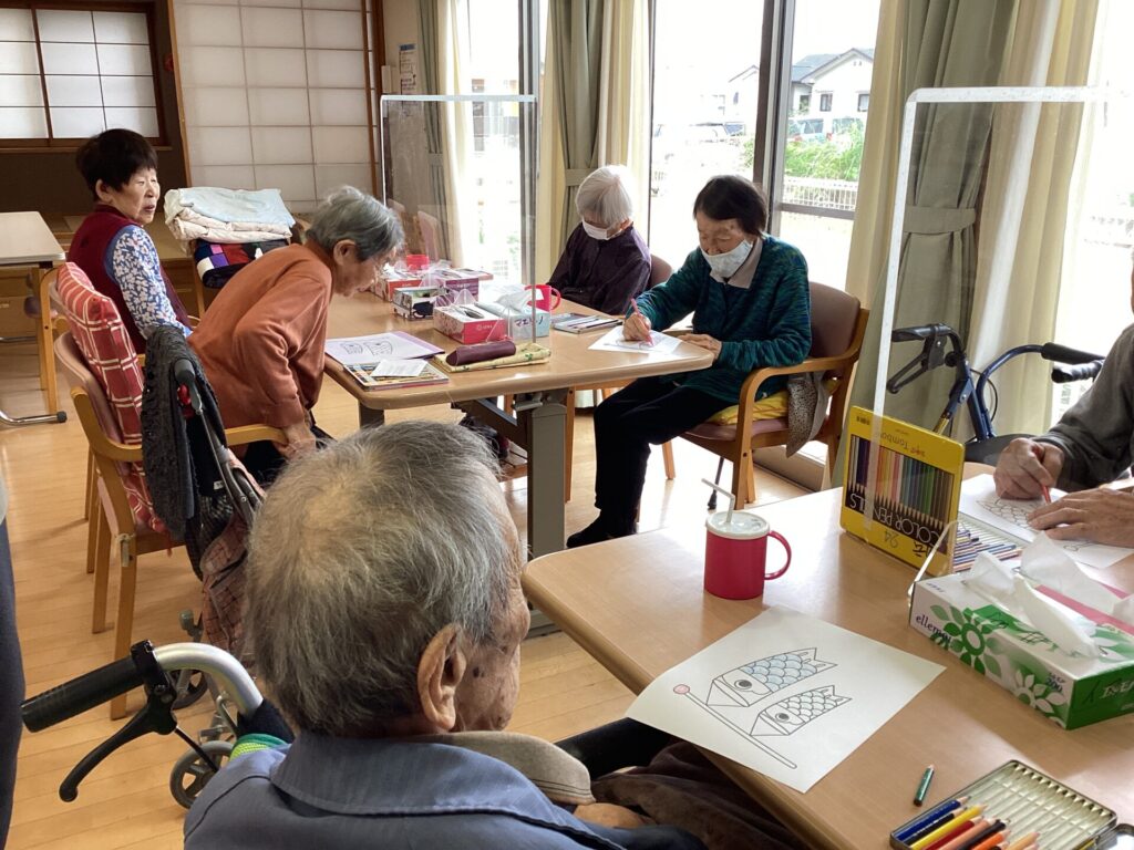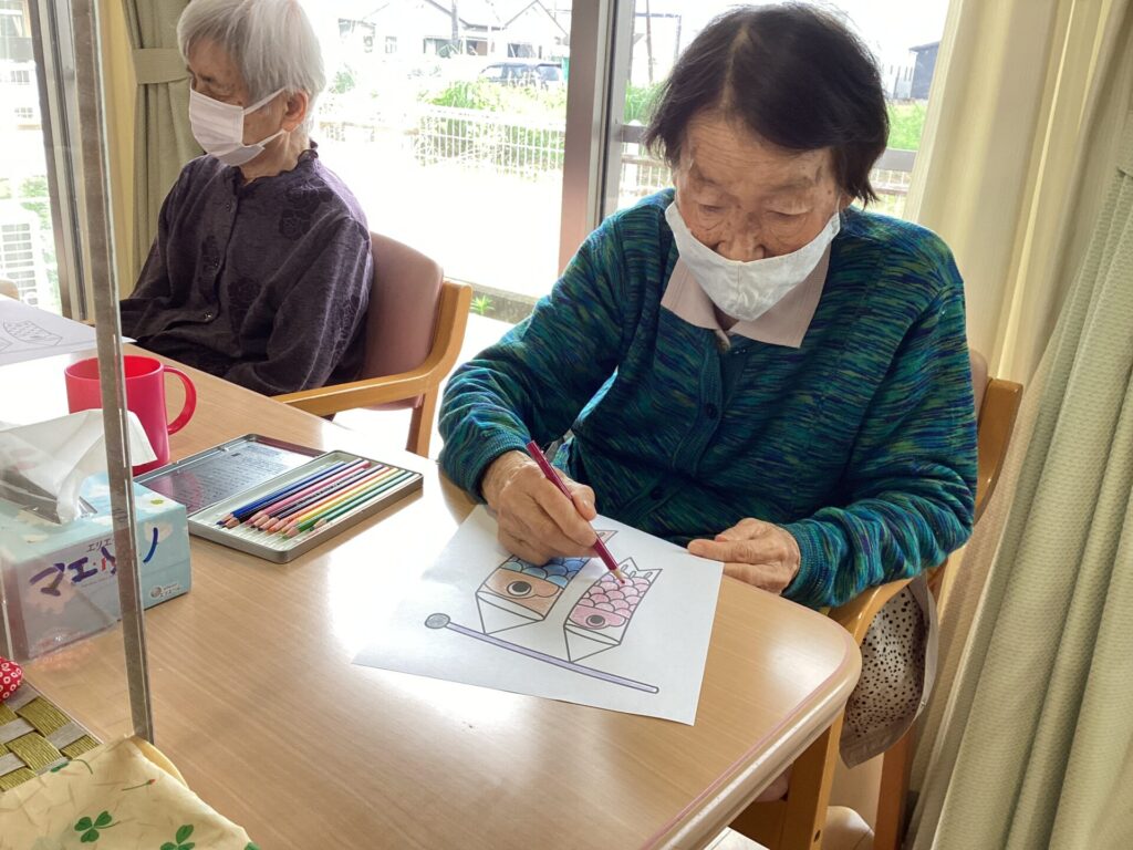 五月のこどもの日に向けてみんなで鯉のぼりの塗り絵に取組みました。